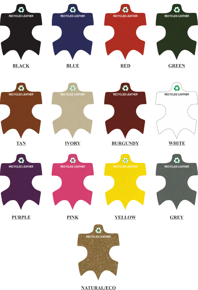 The long square shape offers maximum visibility for your logo on a domed decal, while the eco-conscious recycled leather construction appeals to environmentally aware clients.