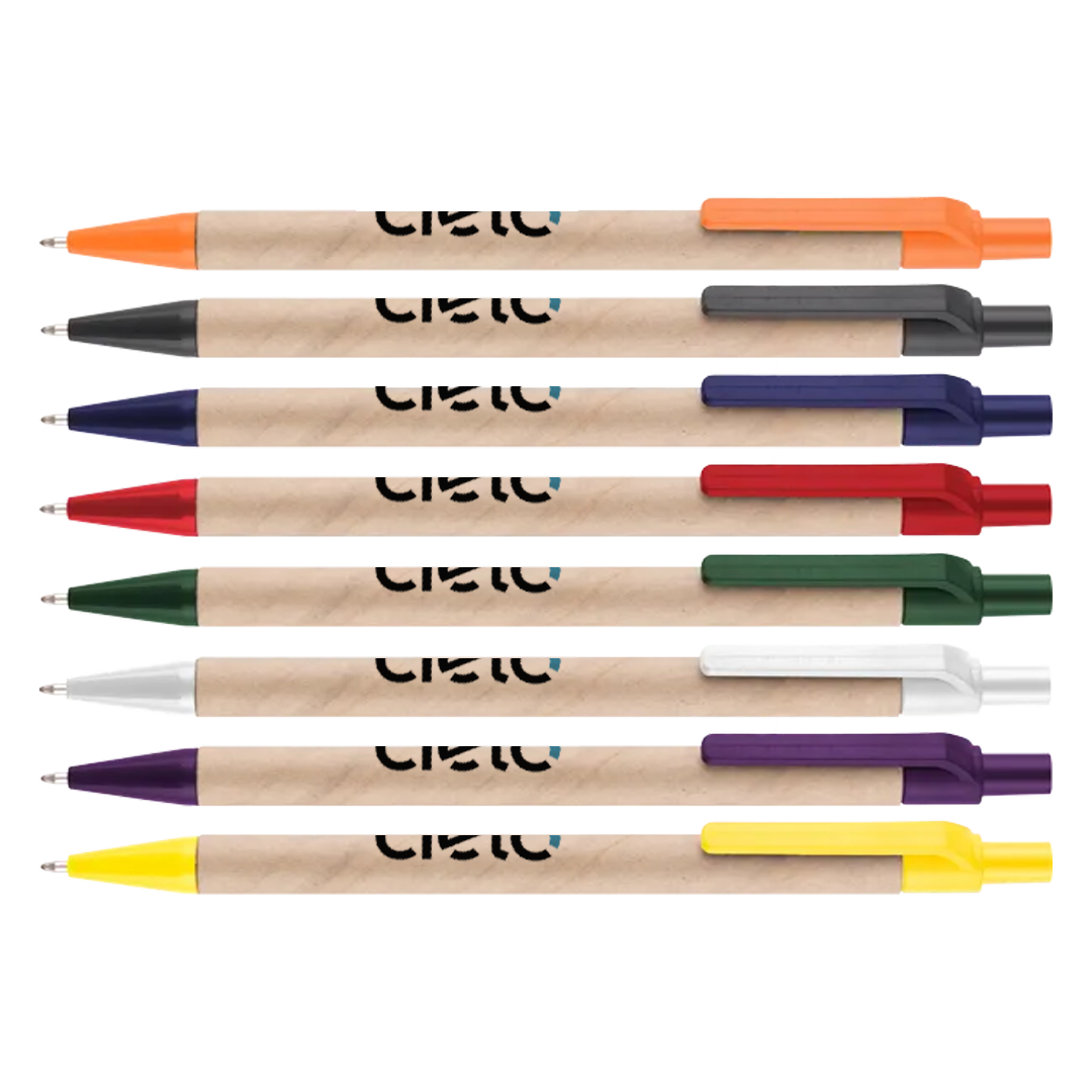 These retractable recycled printed pens are moulded from recycled paper to make the body and come with plastic nib covering and clip.